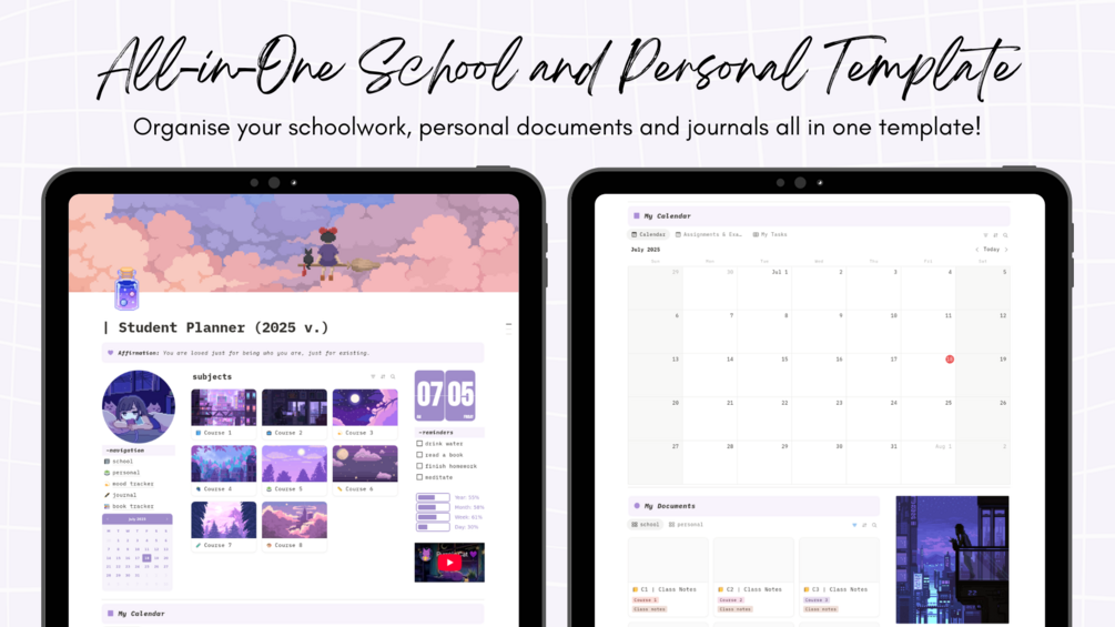 This template includes 8 course pages, synced tasks, journal, mood tracker and reading list!